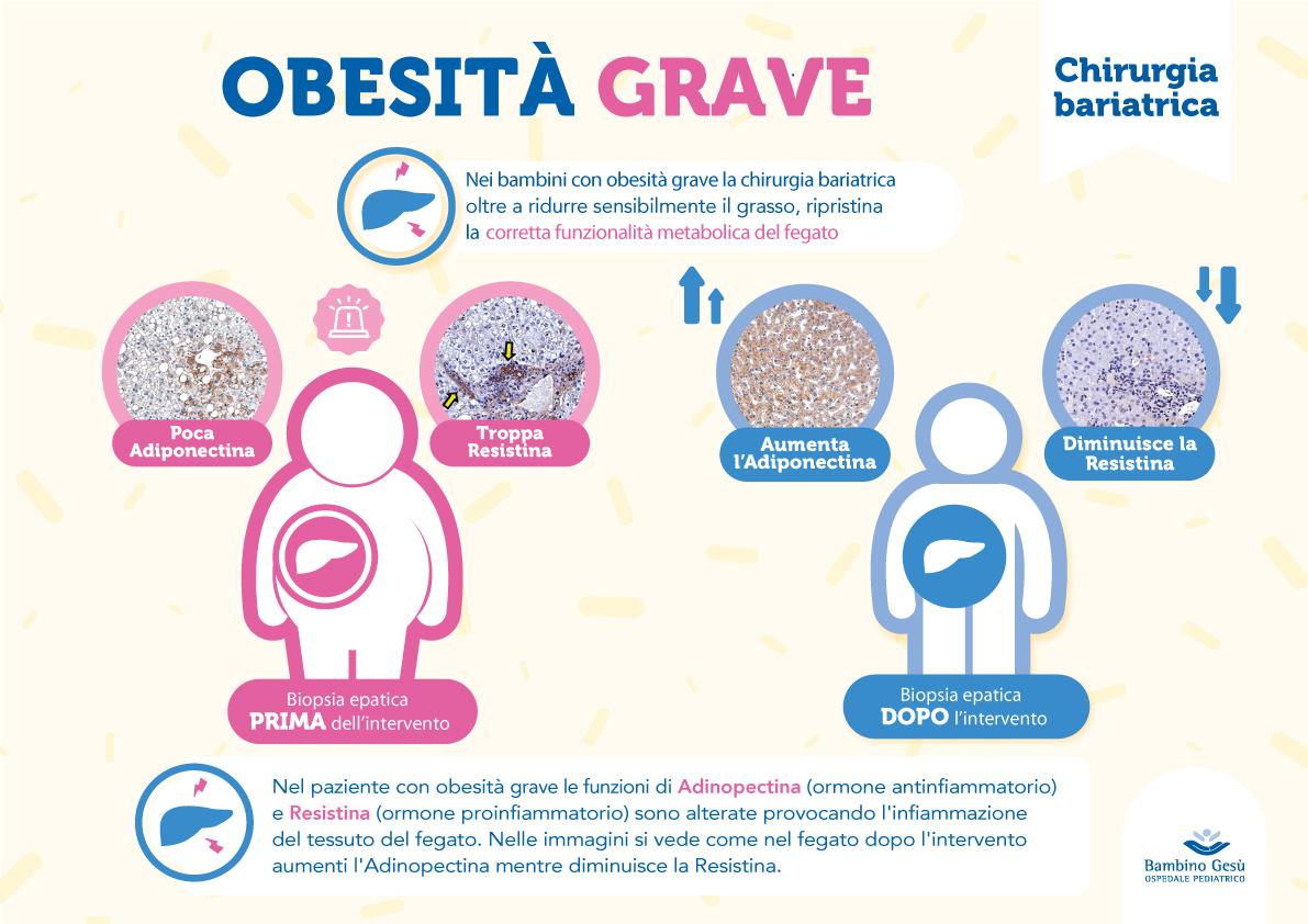 Nei ragazzi con obesità grave il ricorso alla chirurgia bariatrica consente la guarigione del fegato grasso, danneggiato dall'eccesso di peso. Uno studio pubblicato sul Journal of Pediatrics dimostra come l'intervento di riduzione dello stomaco, oltre a consentire la drastica riduzione dell'eccesso ponderale, contribuisca a ripristinare le corrette funzioni metaboliche del fegato, grazie alla riattivazione di due specifici ormoni. Lo studio è stato condotto dalle unità operative di malattie epatometabooiche e chirurgia bariatrica dell'Ospedale Pediatrico Bambino Gesù, in collaborazione con il dipartimento di anatomia e istologia dell'Università La Sapienza di Roma diretto dal Magnifico Rettore professor Eugenio Gaudio. Il fegato grasso, o steatosi epatica non alcolica (NAFLD), è la malattia del fegato più diffusa nel mondo occidentale. Colpisce infatti tra il 5 e il 15% della popolazione pediatrica generale, ma arriva al 30-40% tra i bambini e i ragazzi obesi. È determinata dall'accumulo di grasso all'interno delle cellule del fegato e può evolvere nel tempo, se non trattata adeguatamente, verso l'infiammazione cronica del fegato (steatoepatite non alcolica, NASH), fino alla fibrosi epatica o al carcinoma del fegato. Già da alcuni anni la chirurgia bariatrica è stata introdotta come opzione terapeutica negli adolescenti con obesità grave complicata dalla contemporanea presenza di patologie quali la steatoepatite, il diabete, l'ipertensione arteriosa e le apnee notturne. La tecnica chirurgica principalmente usata in età pediatrica è la sleeve gastresctomy, che prevede una riduzione del 70% circa dello stomaco. «I primi studi sul l'efficacia di questa strategia terapeutica – spiega il professor Valerio Nobili, responsabile di Malattie Epatometaboliche del Bambino Gesù – hanno mostrato non solo una riduzione drastica dell'eccesso ponderale confermata a distanza di tempo, ma anche il miglioramento delle principali patologie metaboliche correlate al l'obesità, compreso il miglioramento dei tessuti epatici danneggiati dalla steatoepatite, con riduzione del grado di fibrosi». Lo studio pubblicato sul Journal of Pediatrics rivela il meccanismo attraverso il quale il fegato degli adolescenti sottoposti a chirurgia bariatrica, in concomitanza del notevole calo ponderale (anche 40-50 kg in un anno), sia nuovamente in grado di svolgere le funzioni metaboliche fisiologiche. Questo avviene infatti grazie alla riattivazione della corretta funzionalità di adiponectina e resistina. Si tratta di due ormoni la cui funzione viene alterata nel paziente obeso, procurando in questo modo l'infiammazione del tessuto principale del fegato e di quello adiposo, nonché l'insorgere di insulino-resistenza, anticamera del diabete di tipo 2. «Alla luce di questi risultati – spiega il dottore Francesco De Peppo, responsabile di chirurgia pediatrica della sede di Palidoro del Bambino Gesù – l'intervento di gastrectomia non va considerato come una soluzione meramente demolitiva, ma come una vera e propria terapia metabolica, in grado di ripristinare le vie metaboliche fisiologiche precedentemente compromesse dal tessuto adiposo presente nei casi di obesità patologica complicata».